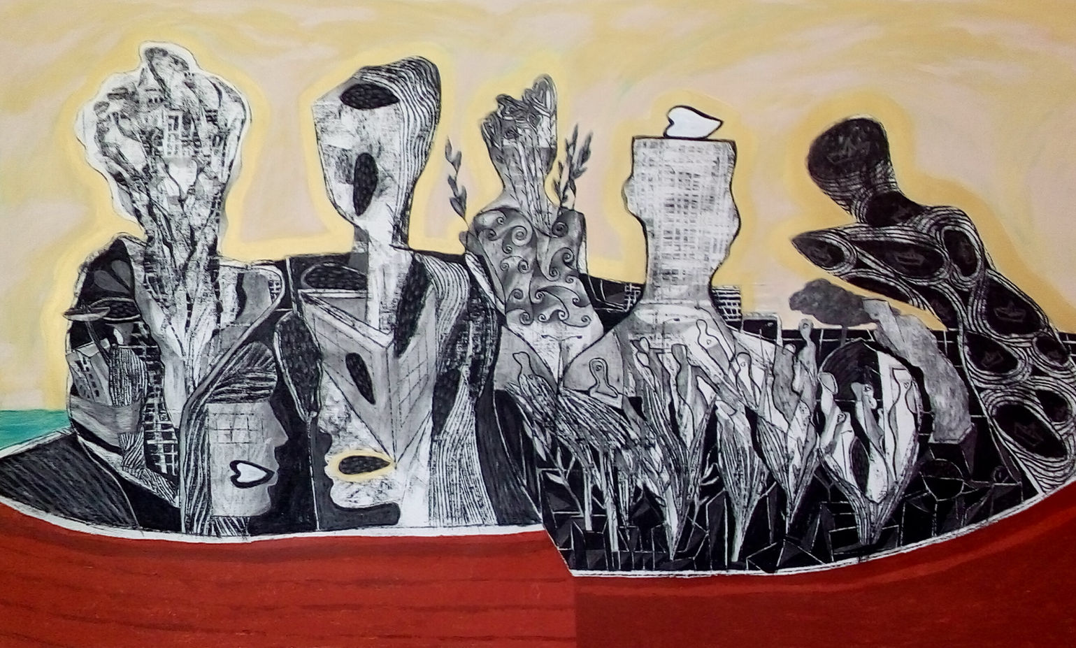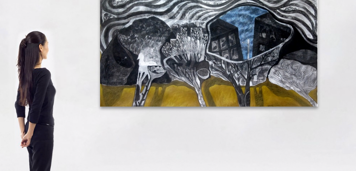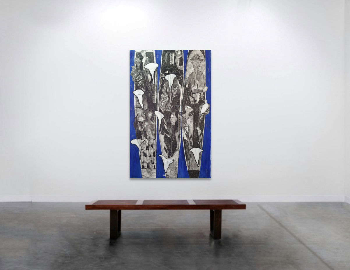 Desde hace una década, he desarrollado más intensamente el dibujo al carboncillo, siendo este el protagonista creador de realidades imaginarias en el lienzo, el papel o en algún objeto intervenido. Utilizo el color al acrílico como elemento contrastante, para hace más evidente todo ese mundo de texturas, formas y símbolos que son parte de mi lenguaje pictórico.